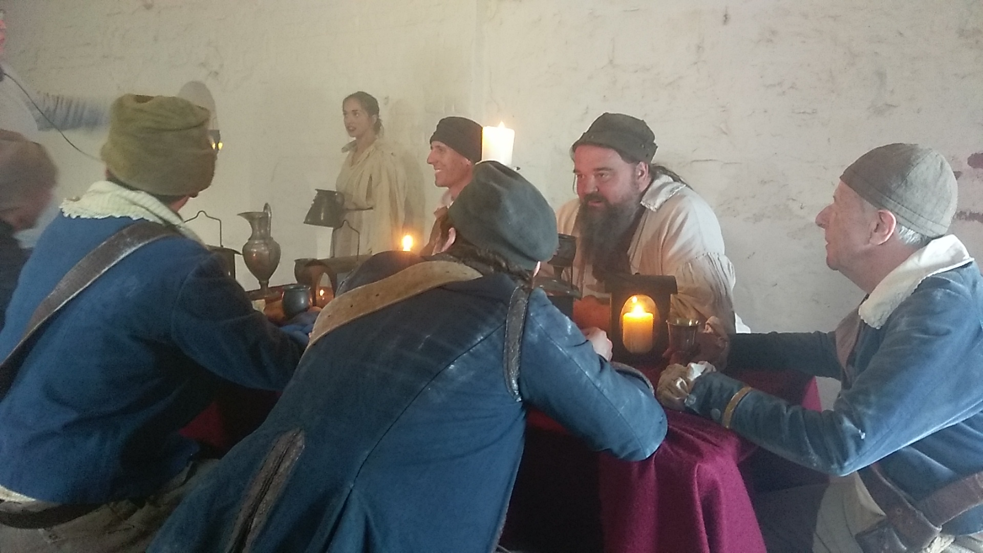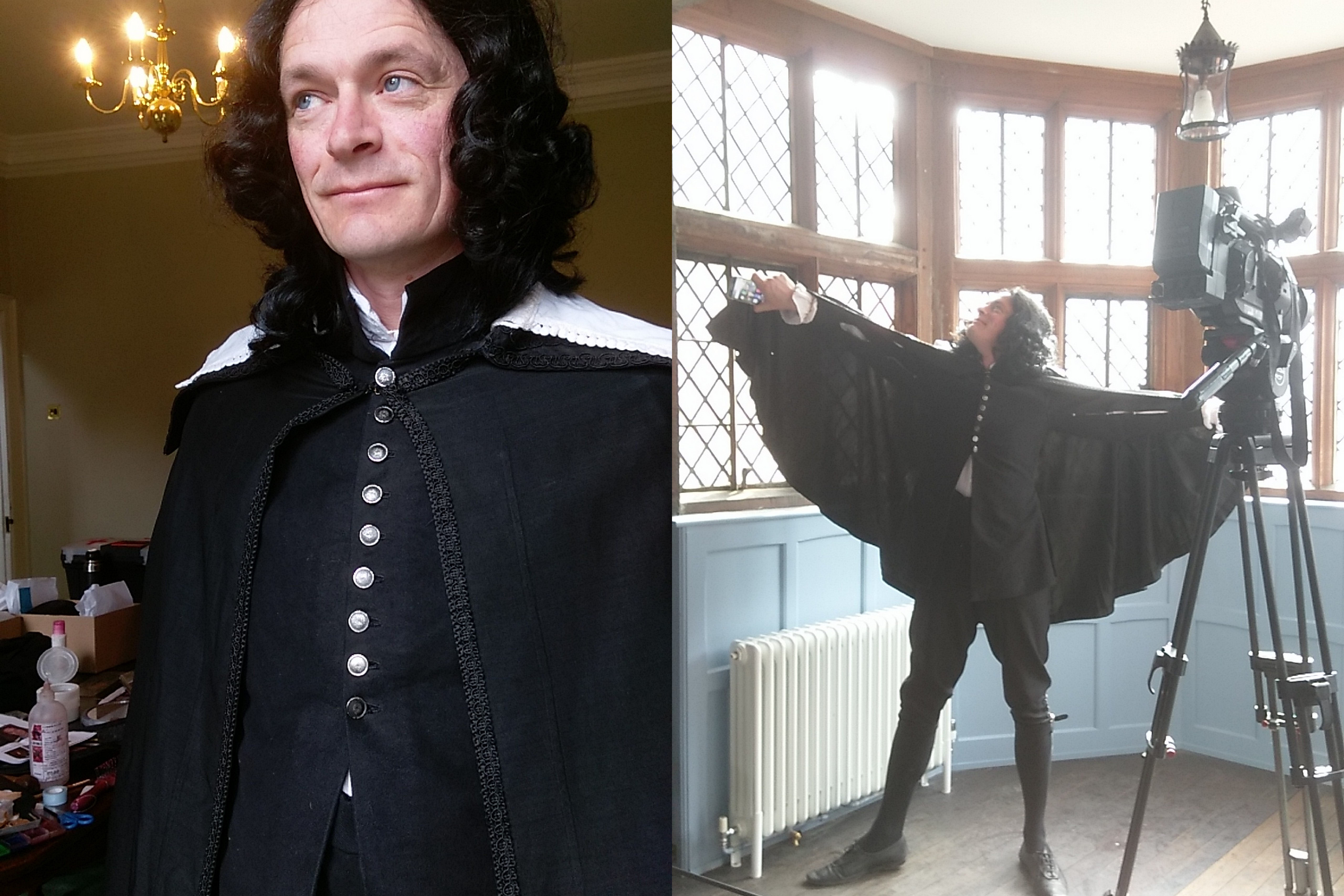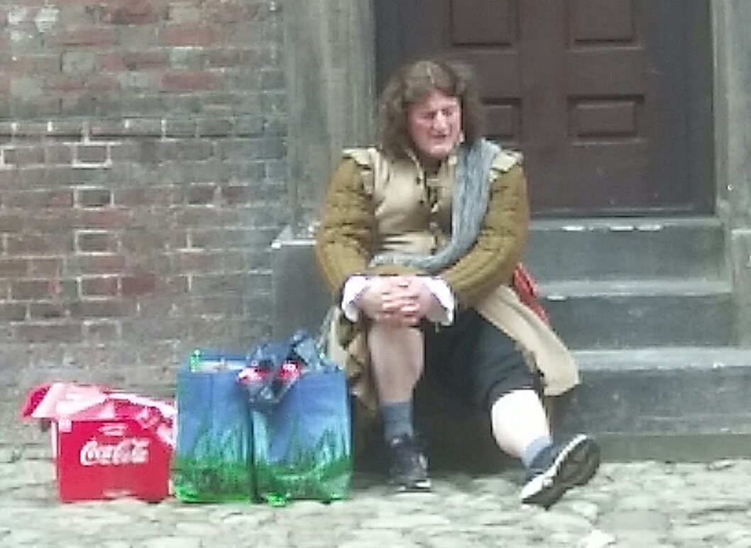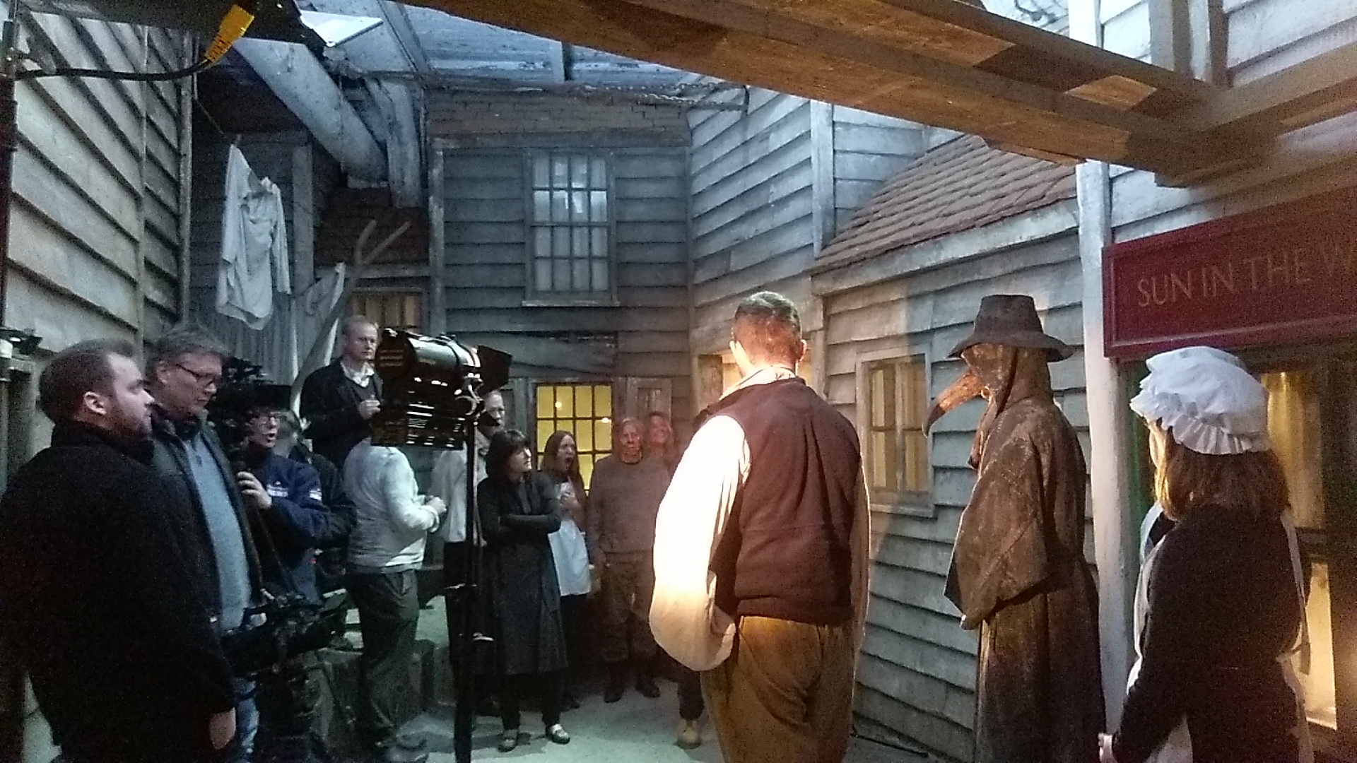 London was just recovering from the Great Fire and The Plague was still prevalent within the city and right across Britain. The Bubonic Plague was spread by insects, mainly fleas, with bacteria entering the body through bites. The infection then spread through the body to the lymph nodes, causing them to swell and break open, causing what we recognise as buboes. Extremeties of the body, such as feet, fingers, nose and ears became gangrenous and the tissue began to die, resulting in death within about ten days of contracting the disease. Bodies were taken through the streets and buried in mass burial pits known now as Plague Pits. A Plague Doctor was hired by town leaders during the epidemic and treated both the wealthy and the poor. Often these doctors were not medically trained physicians and were unable to cure victims but gathered information on contamination and deaths. They wore a beak-like mask (check out the photo below) which was filled with aromatic items – the mask was designed to protect them from the putrid air which was, at the time, seen to be the cause of infection. The costume weighed an absolute ton and was incredibly hot for our actor to wear!